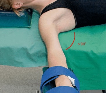 •   Arm abduction in supine patients should be limited to 90 degrees. Patients who are positioned prone may comfortably tolerate arm abduction greater than 90 degrees.